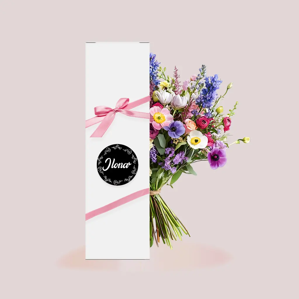 Saat kauniisti pakatun kukkaboksin, jonka sisällöstä sidot itse oman kimpun ohjeiden avulla.